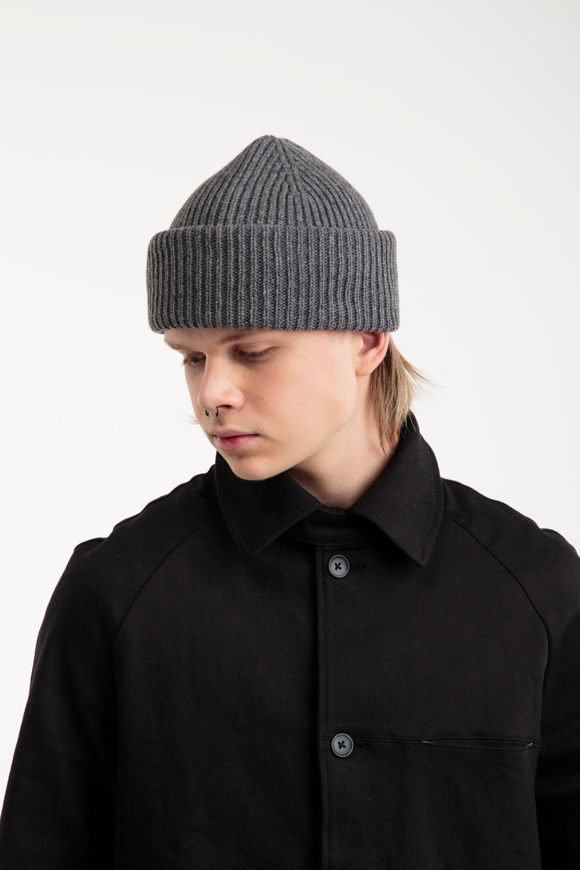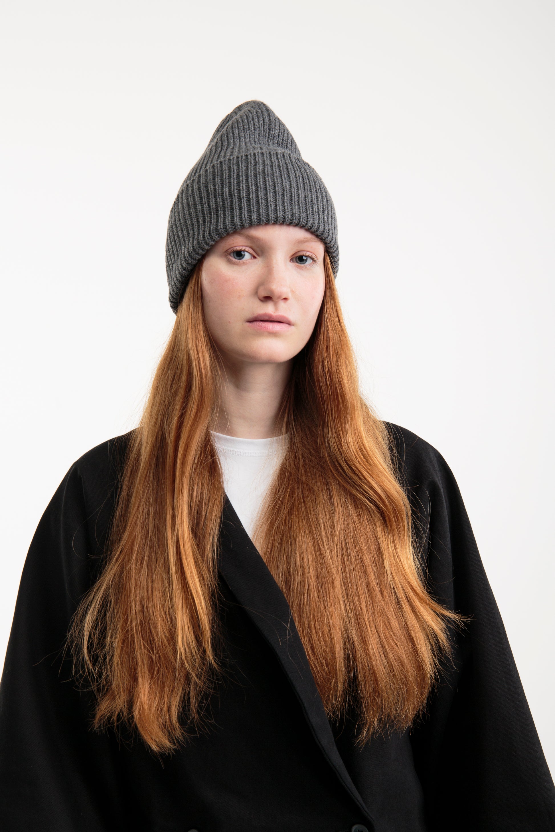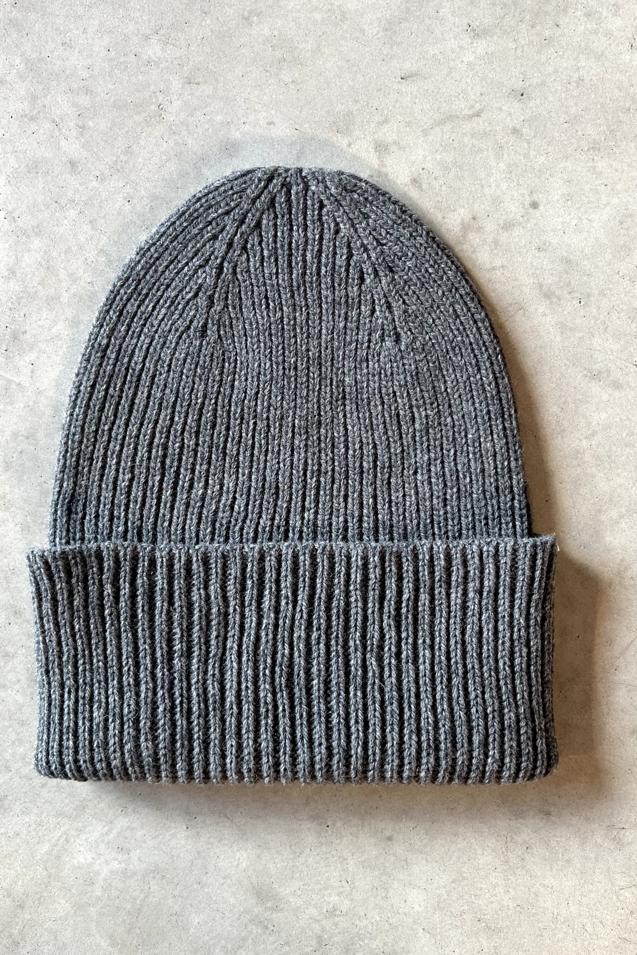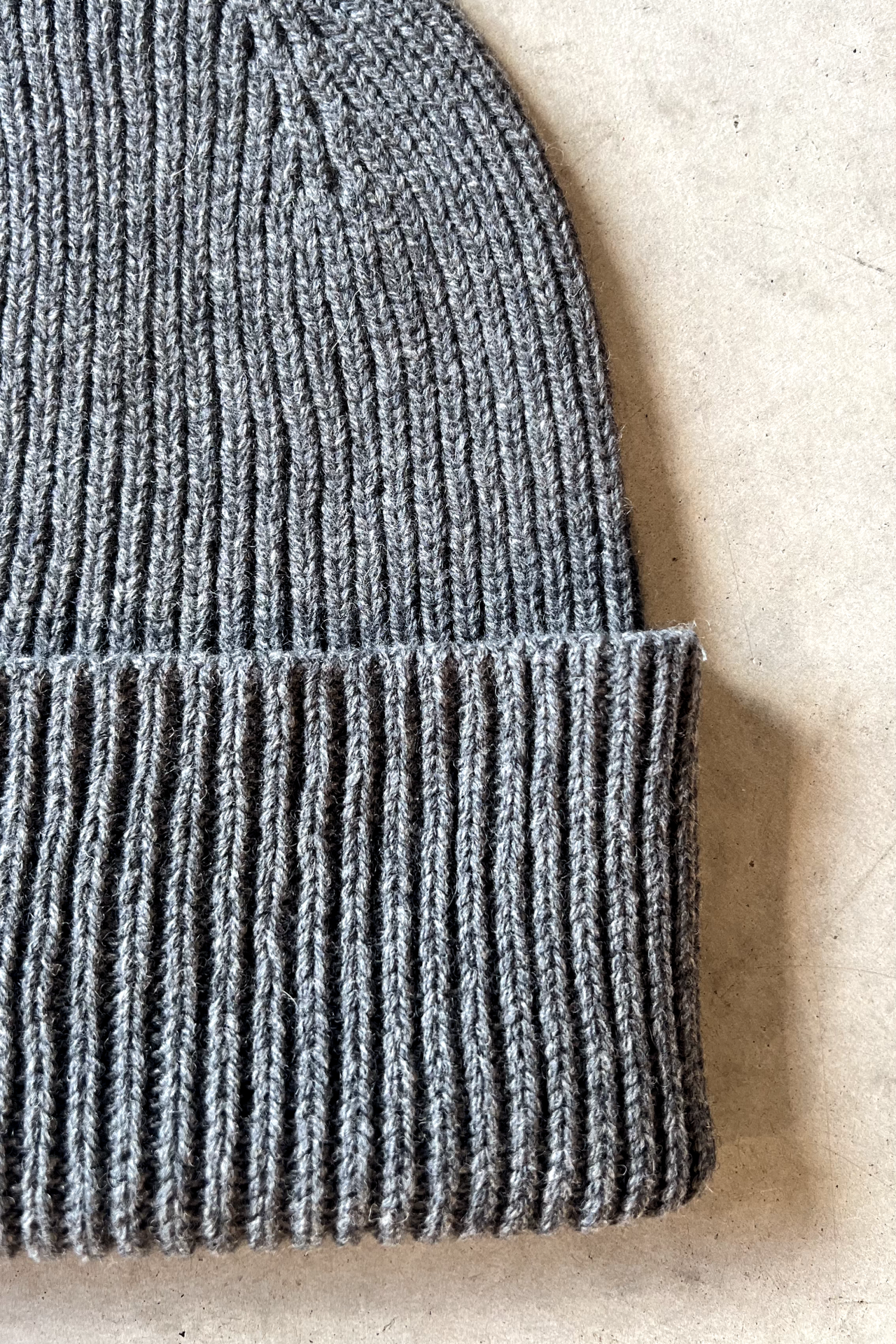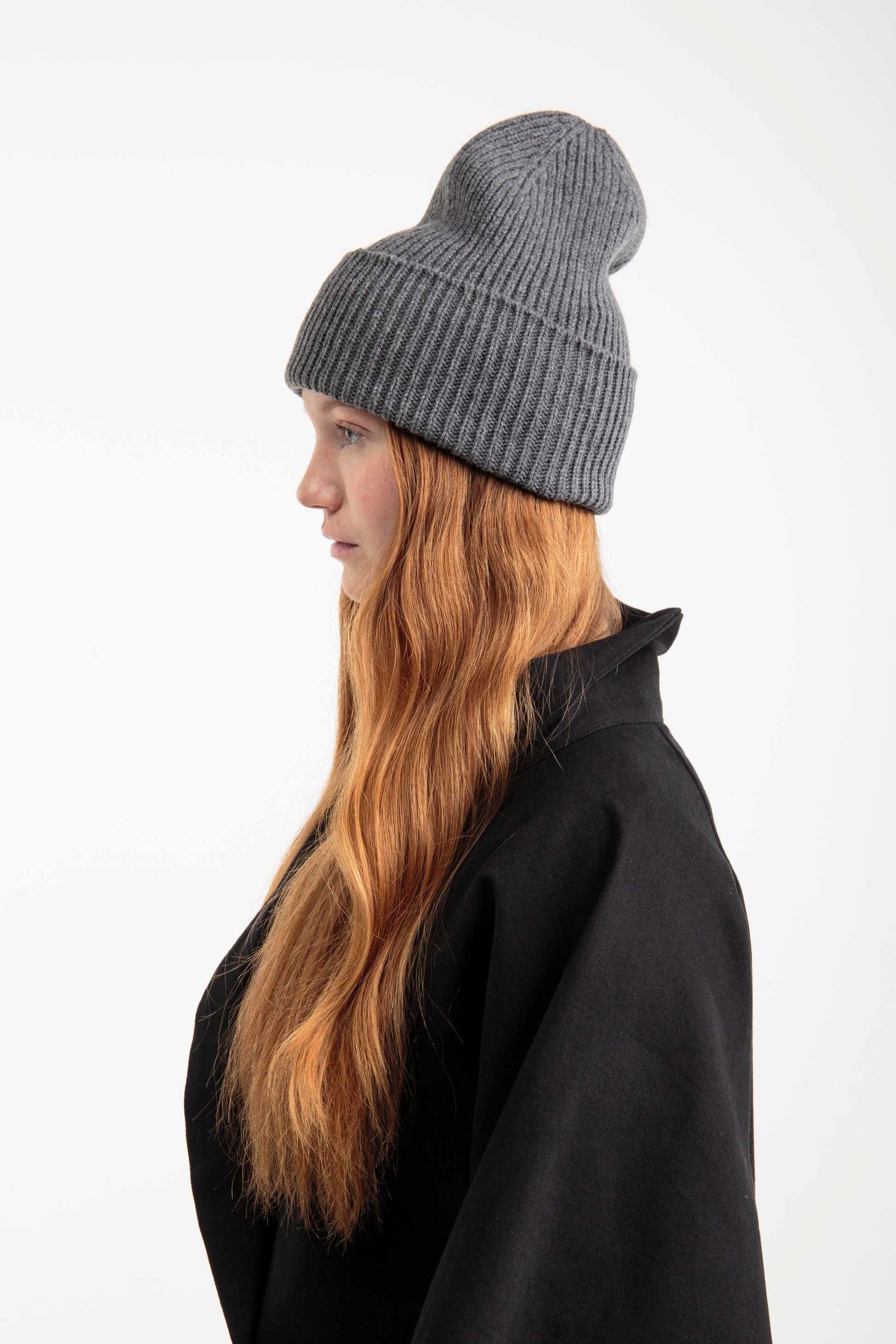 Grey seamless hat made with 100% recycled wool from post-consumer garments. The yarn is sourced from leftover materials from our seamless sweater production.