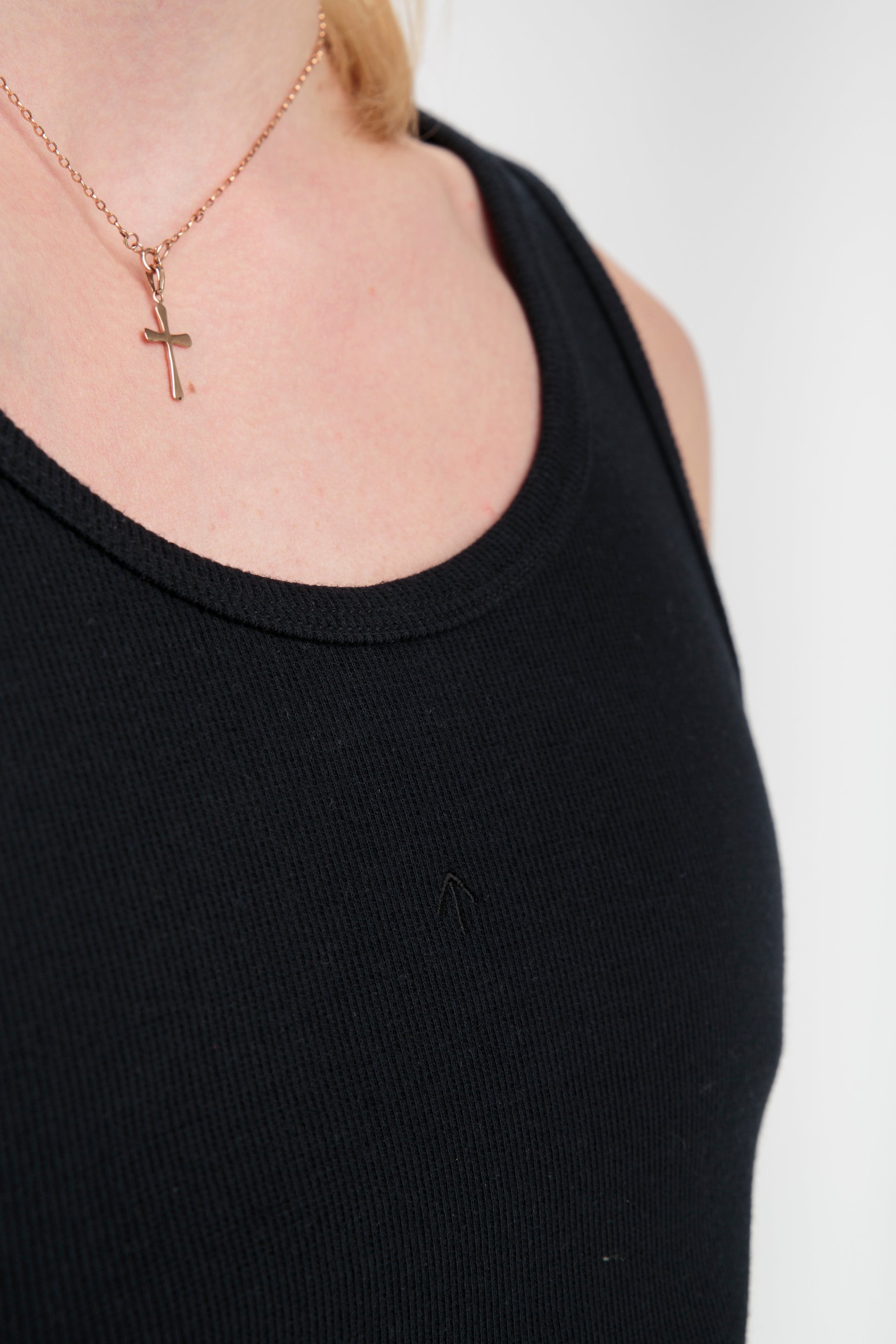 Classical ribbed tank top with Reet Aus signature arrow embroidery on the chest.